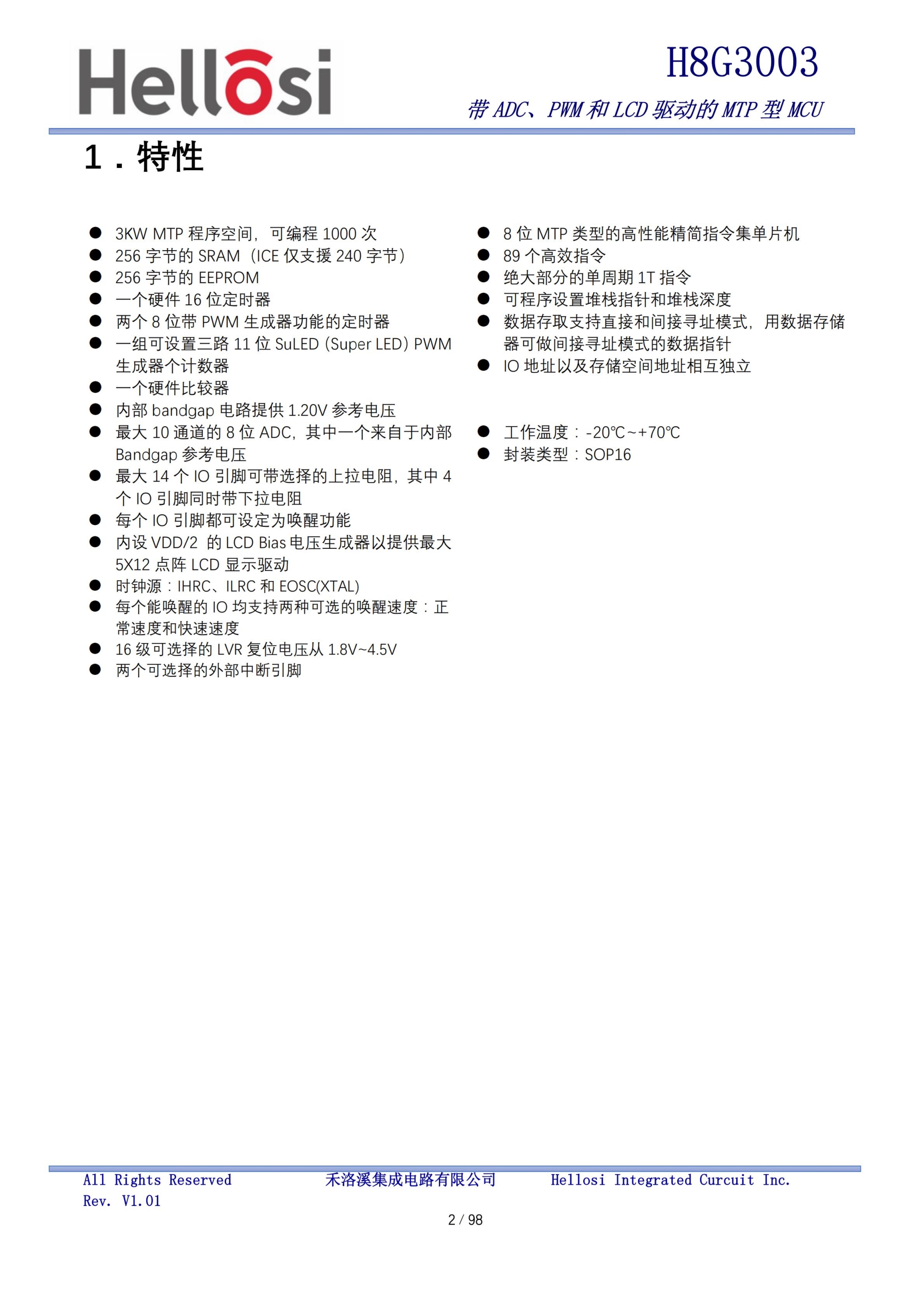芯片内置 3KW MTP 程序程序存储器以及 256 个字节 SRAM 数据存储器。